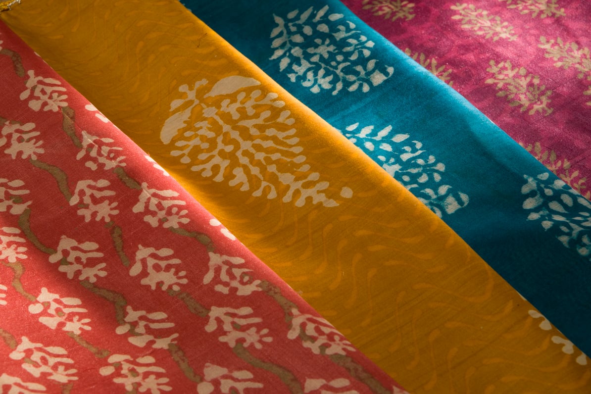 Exquisite handwoven silk sarees and fabrics from nearby Chanderi & Maheshwari, known for their lightweight texture, glossy transparency, and intricate zari borders.