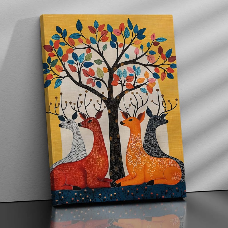 Traditional tribal paintings featuring nature, mythology, and village life. Each piece tells a unique story of tribal folklore through vibrant dots and lines.