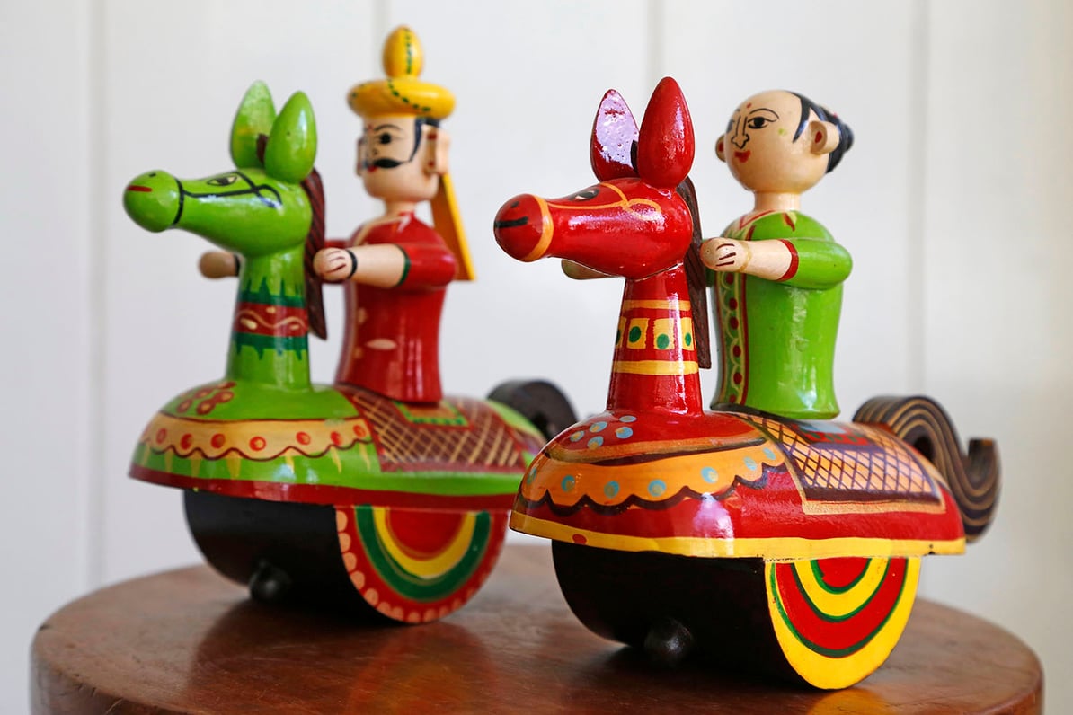 Eco-friendly wooden toys from Karnataka, lacquered with natural dyes—a UNESCO-recognized craft that uses ivory wood to create safe and colorful playthings.