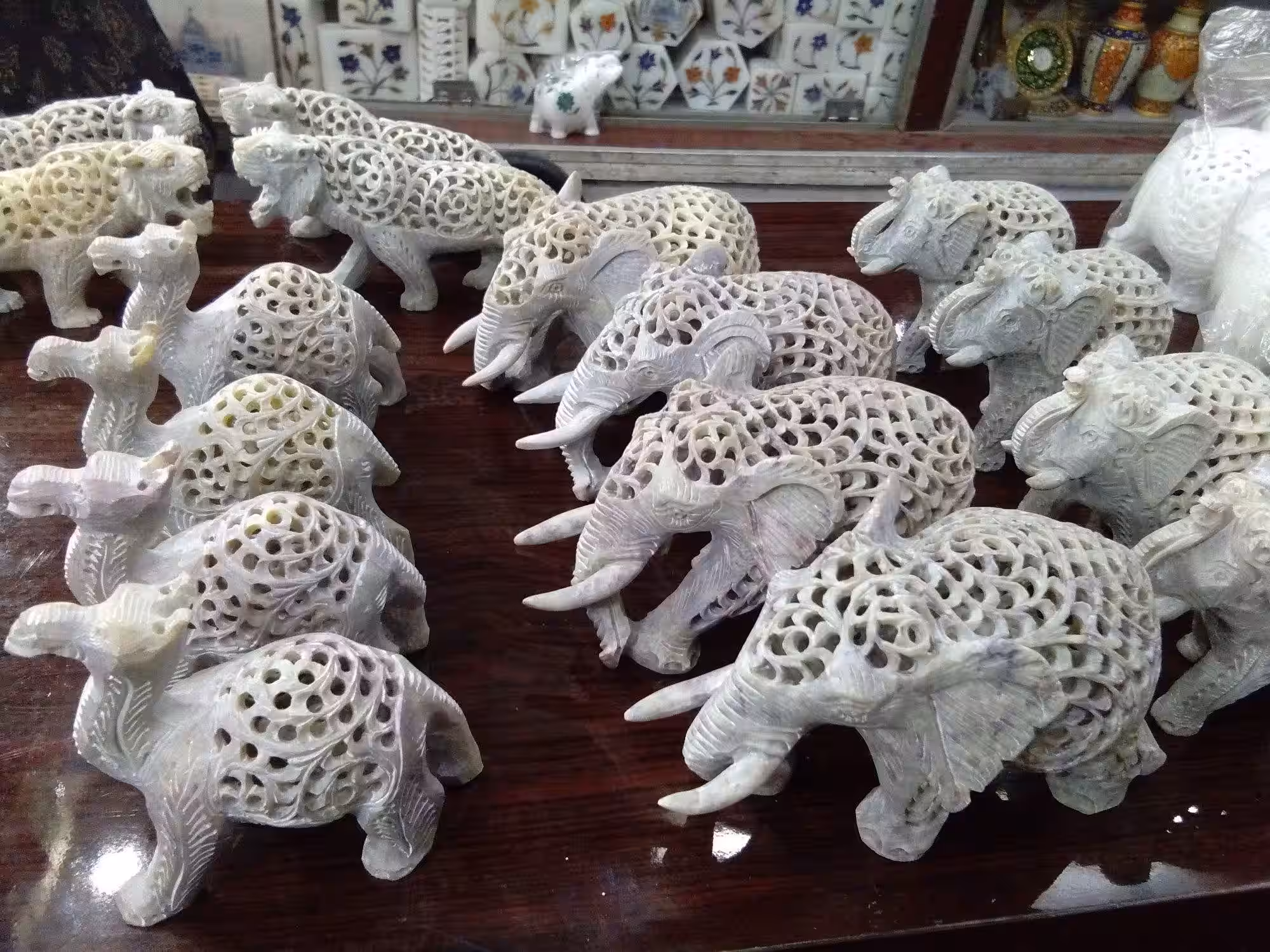Exquisite marble work from Agra featuring Taj Mahal–style Pietra Dura inlay work, visible in lamp bases, decorative plates, and coasters of exceptional quality.